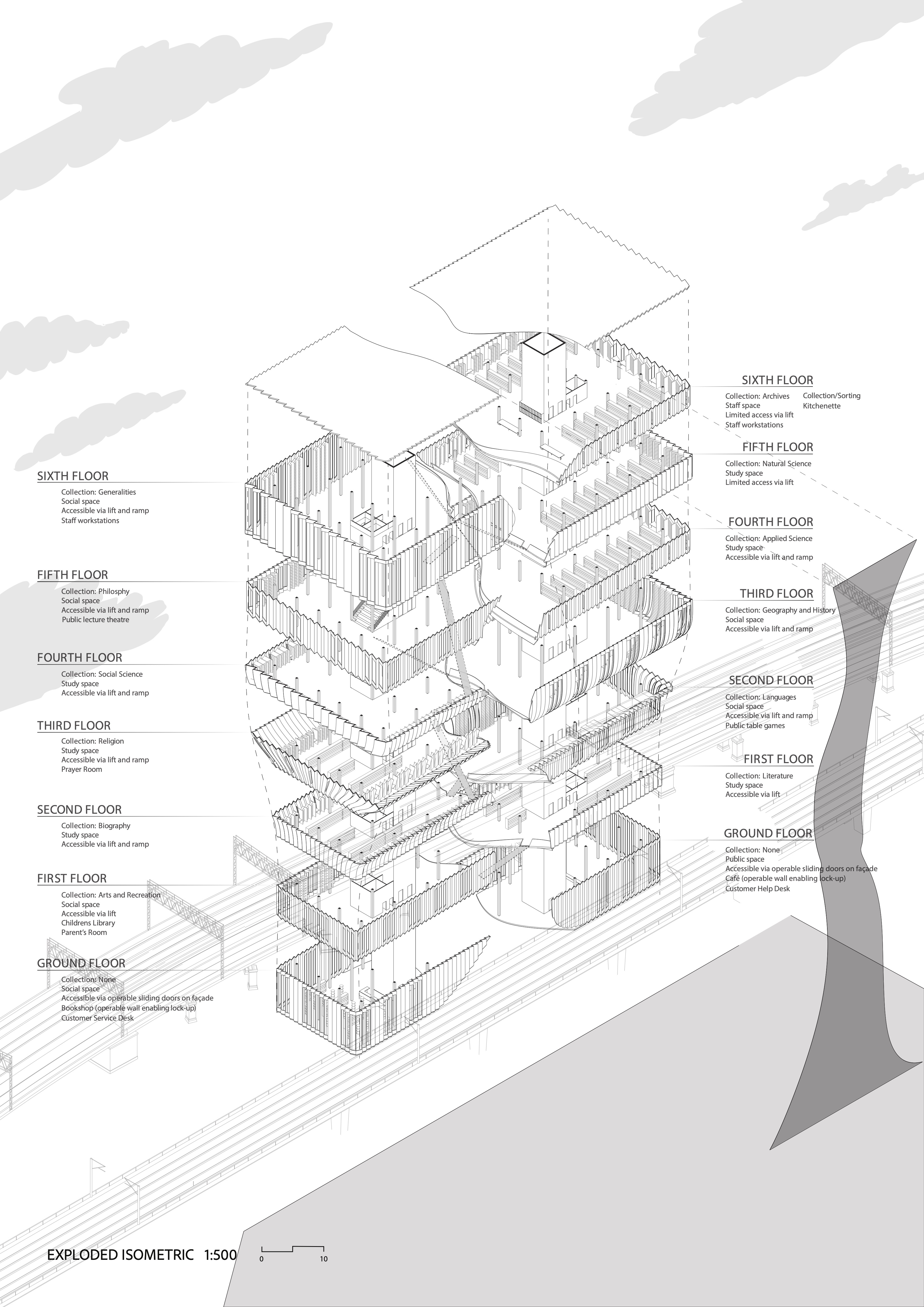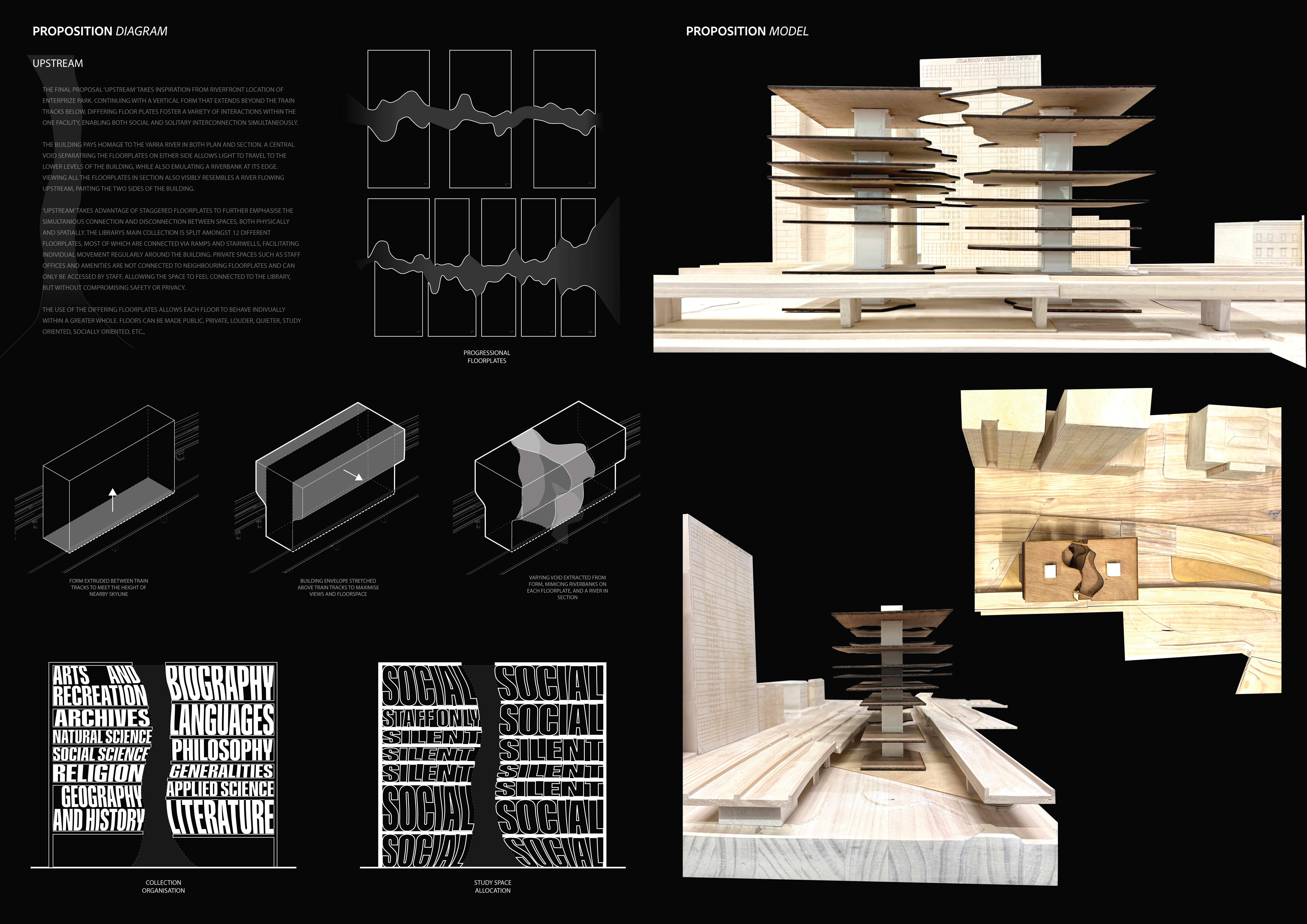 The Library and The City is a proposal placed along Enterprize Park in Melbourne, Australia, epitomizing the principle of connection—both in its physical setting and in its architectural design. The project connects the site to its natural surroundings, the people who use the space, and the collection it houses. The final design separates the library's collection across 16 different floorplates, each with unique ceiling heights that tailor the auditory environment, providing users with a choice between social interaction and solitary study. The architectural form of the building draws direct inspiration from its riverside location; the edge of each floorplate is designed to resemble a riverbank, creating an effect in the building’s vertical section that suggests a river flowing through the structure.